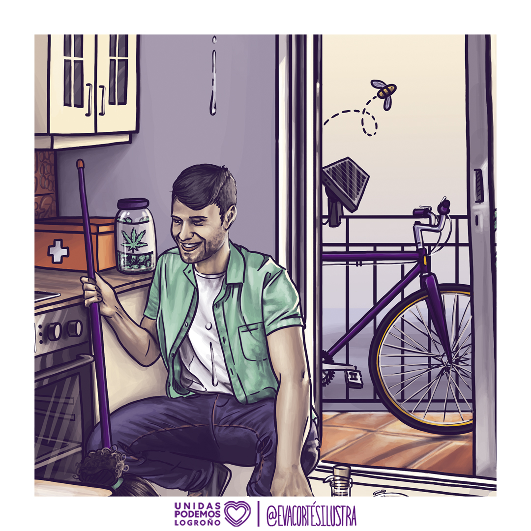 En la ilustración se pueden encontrar multitud de detalles reivindicativos sobre el tema, una persona mayor cosiendo y reparando ropa con un costurero, cuya bombona de oxigeno contiene dentro una planta. A un padre limpiando la casa con vinagre y bicarbonato. Un planeta tierra asándose como un bizcocho en el horno, el pollo asado se escapa de una bandeja en la que estaba preparada con su guarnición (como critica al excesivo e insostenible consumo cárnico). Un gato tirando un reloj de arena (porque se nos acaba el tiempo para revertir el calentamiento global), una bicicleta, tomateras en el balcón, abejas…. y un oso polar en el polo norte cuyo bloque glaciar se derrite y provoca una gotera en casa.