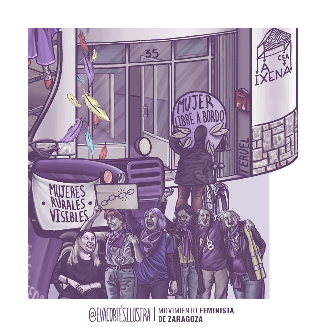Pese a que este año, el cartel debía abarcar solamente a la ciudad de Zaragoza y no a todo Aragón, con este cartel se rinde un homenaje a esos espacios comunitarios y de encuentro que son el hogar asambleario de los diferentes movimientos feministas y sociales de todo Aragón. Por ello, el cartel se compone de las letras «8M» tumbadas en el suelo, generando bloques de edificios, en las que se reconoce, en primer plano, el CSC Luis Buñuel de Zaragoza (tras su perdida, debido a las políticas de derechas del Ayuntamiento) y también, más al fondo, en el bloque con forma de 8 tumbado, la CSA A Ixena (Teruel) y el local del Espacio Rosa Luxemburgo (donde se reúnen las feministas de Huesca).