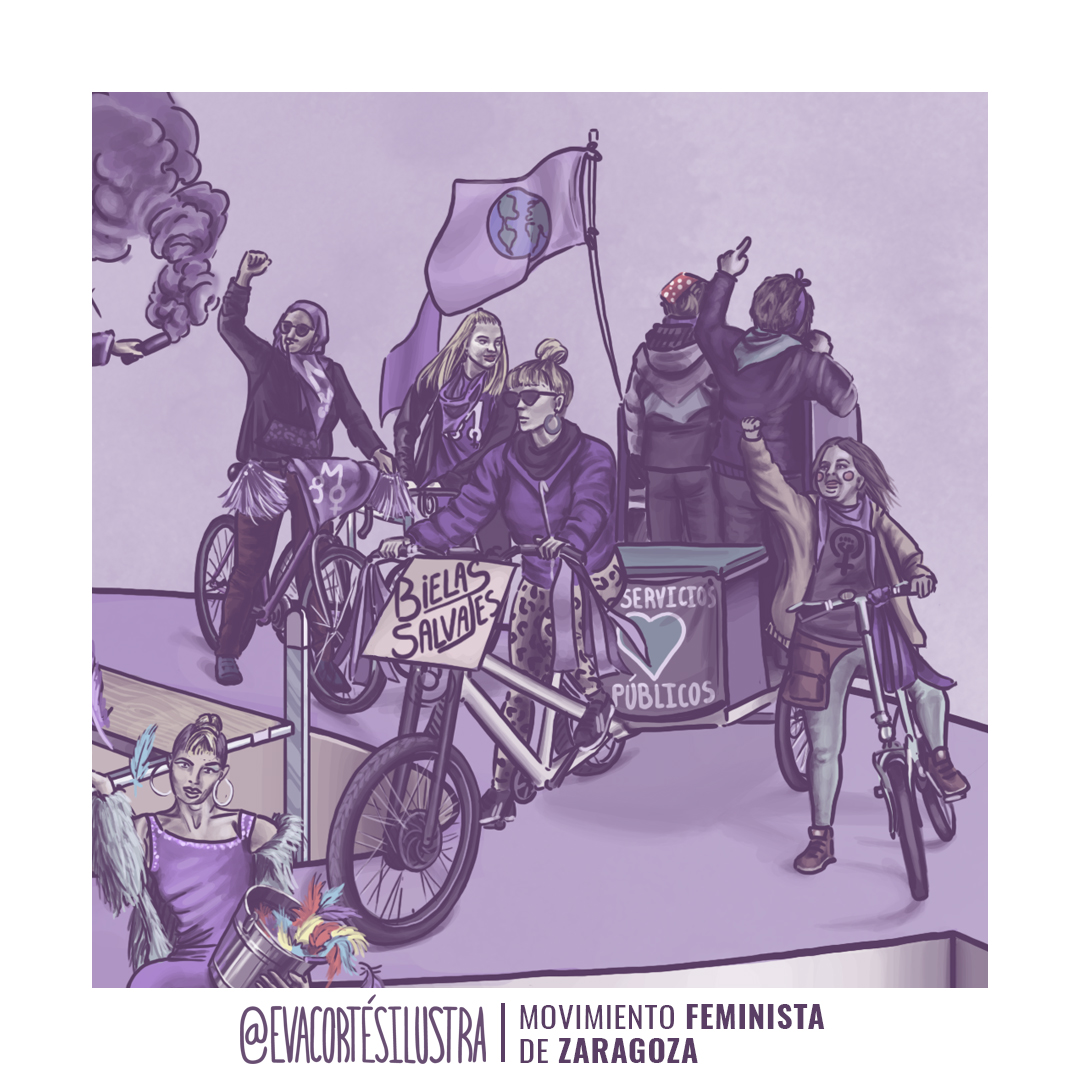 Campaña 8M Zaragoza 2023: Ilustración, maquetación y diseño para todas las necesidades de la jornada de protestas en la ciudad aragonesa de Zargoza, cartelería y programación para difusión física (offline) y en redes (online)