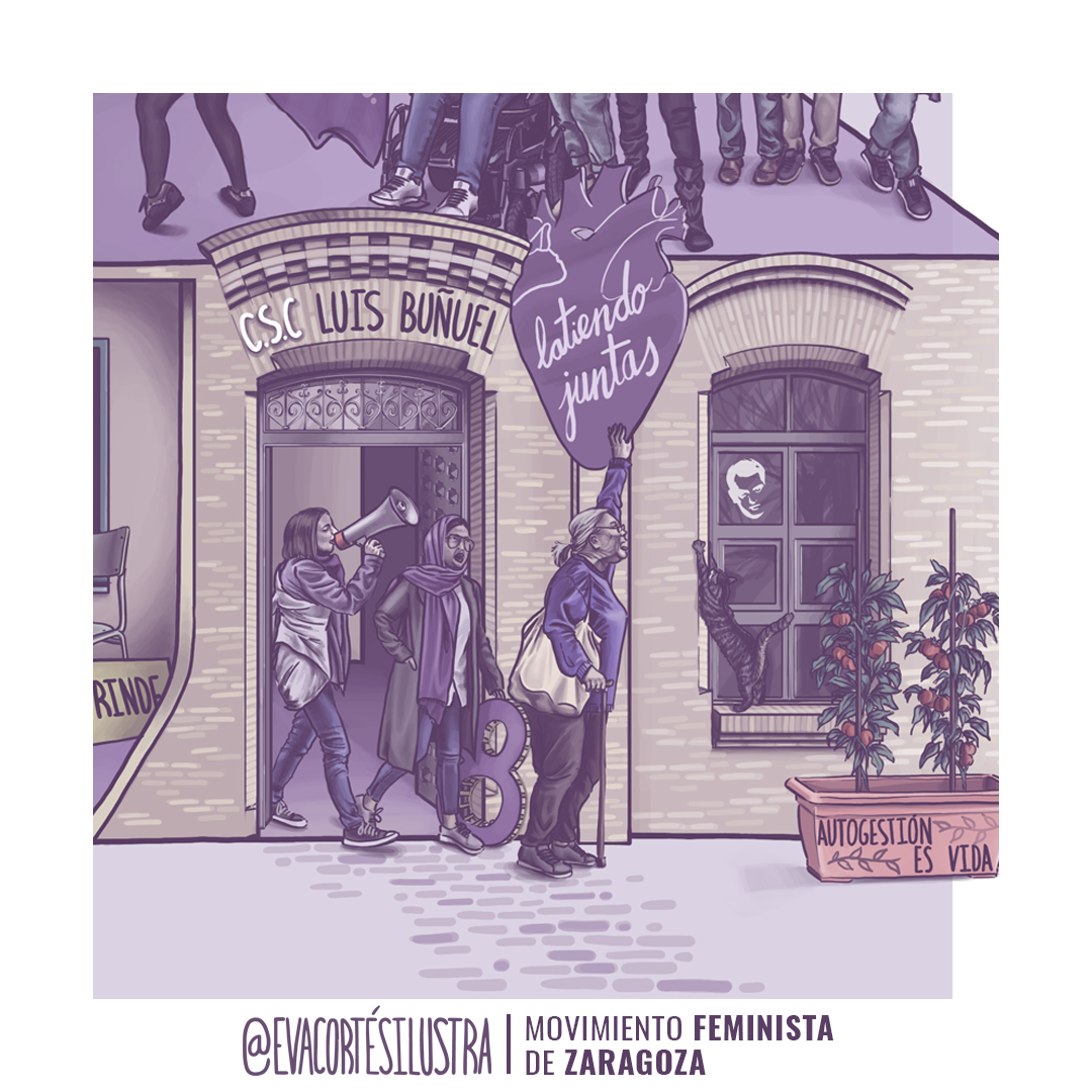 Un cartel que pretendía representar las consignas del movimiento estatal de ese año, donde las mujeres se sintieran representadas, dibujadas y reflejadas en su lucha colectiva. Ese año, en 2023, tenía la necesidad especifica de poner en valor los espacios sociales y comunitarios, debido al reciente desalojo y cierre del histórico centro social comunitario Luis Buñuel, tras más de 10 años de actividades y cesiones.